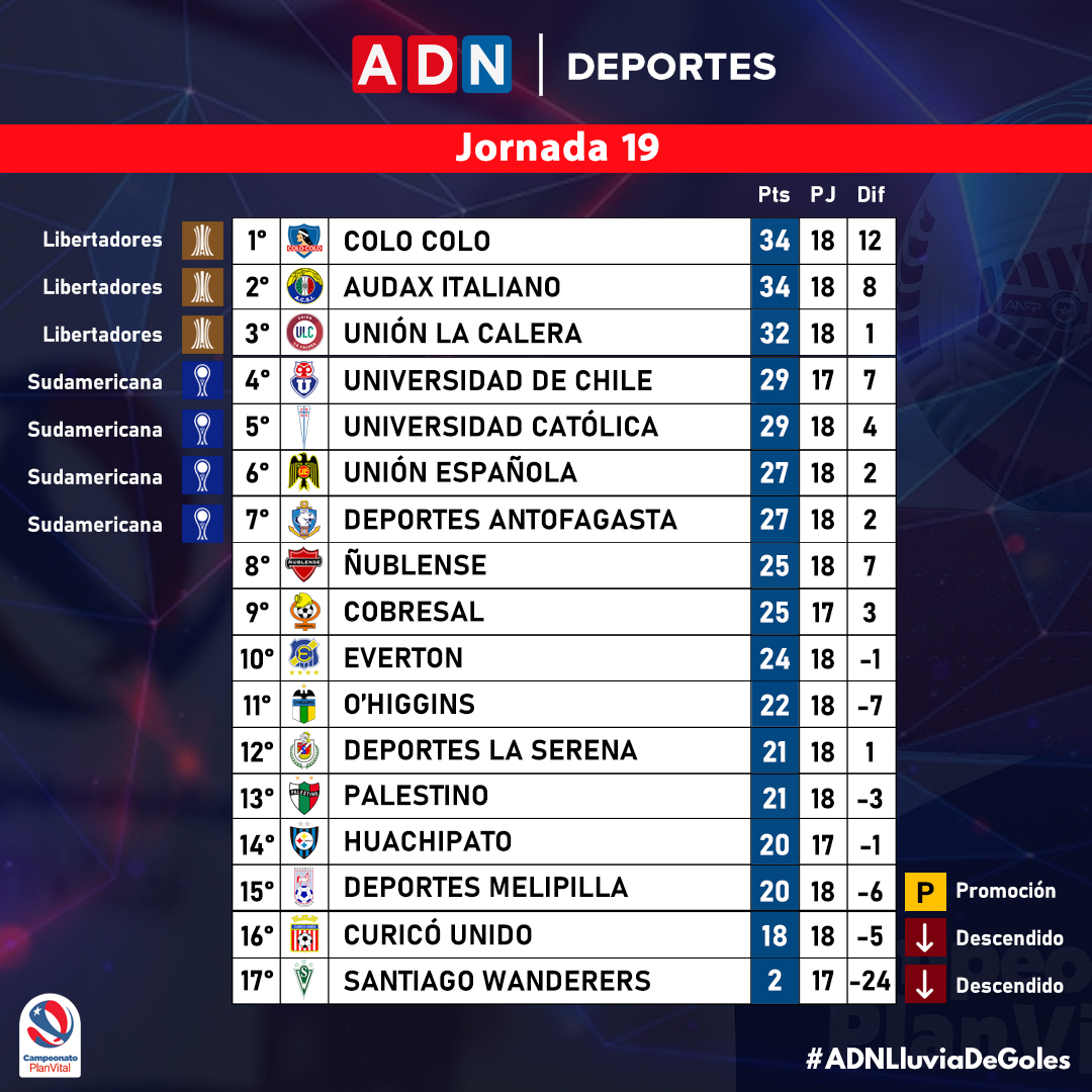 Con los descensos casi definidos. Así quedó la Tabla de Posiciones tras el triunfo de Curicó sobre La Serena Los Torteros vencieron por 2-0 a los. 12 Septiembre 2021 Santiago Wanderers 1500 Cobresal Elías Figueroa Detalle Partido Audax Italiano 1730 Unión La Calera El Teniente Detalle Partido.